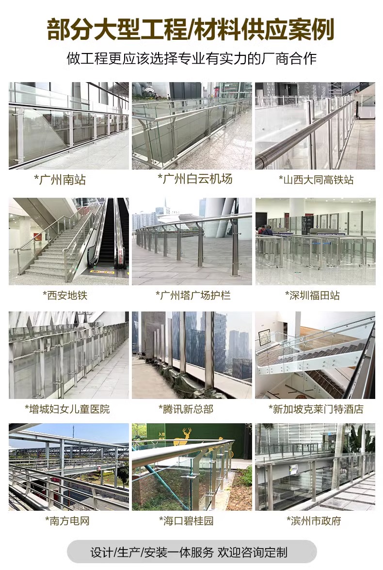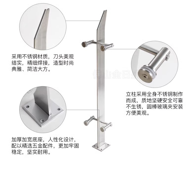 此產品為工程護欄立柱,多次被市政府,高鐵站,飛機場,超商,大型企業采購。強度高,耐磨損,耐腐蝕,色澤好。加厚價款底座更加結實耐用,圓棒玻璃夾安裝方便